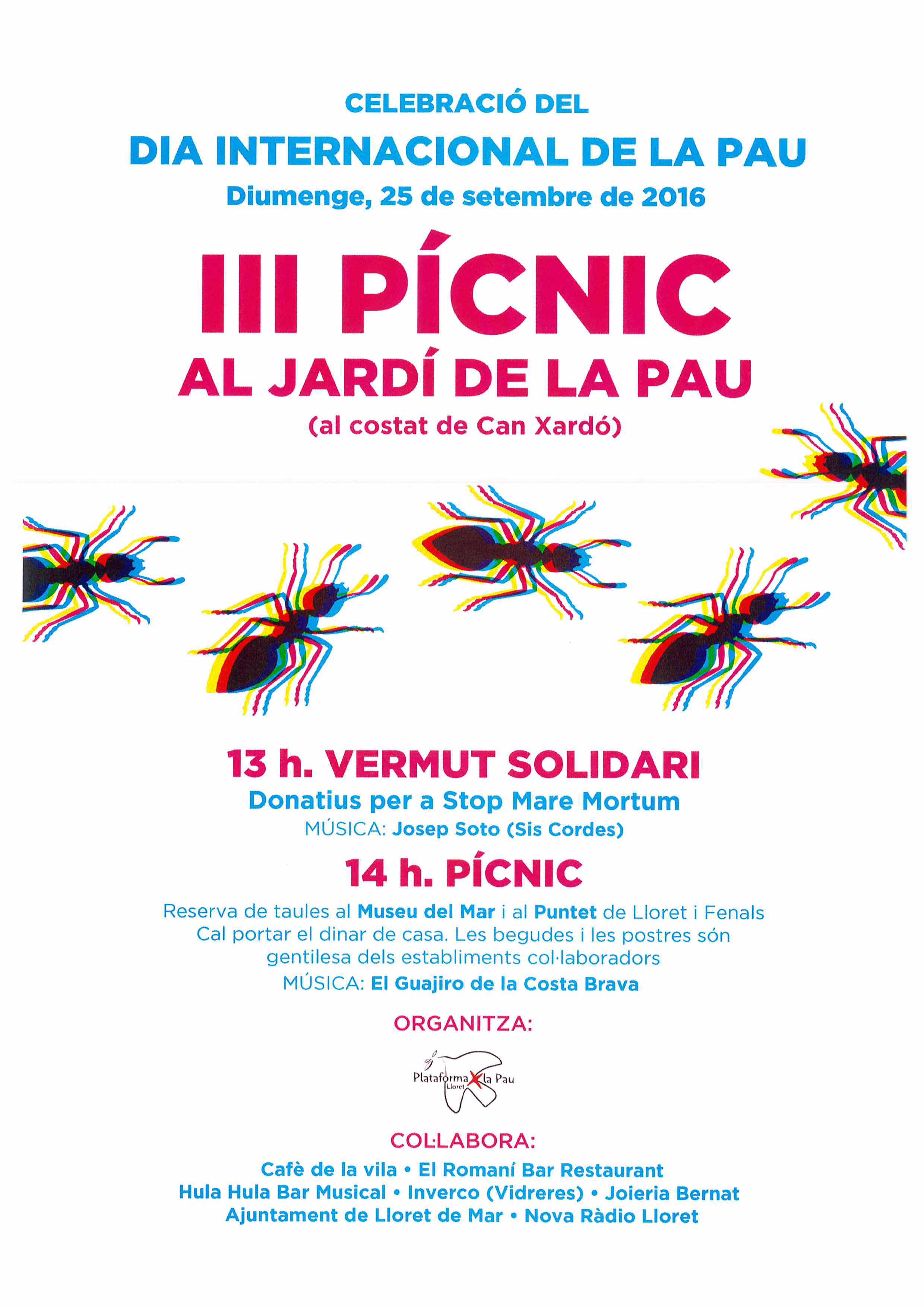 El pícnic començarà a les 14.00 h del migdia però una hora abans, a les 13.00 h, i com a novetat, han preparat un vermut solidari on es recolliran donatius per a la plataforma ciutadana Stop Mare Mortum que té per objectiu fomentar un canvi en les polítiques europees d’estrangeria i migratòries. Stop Mare Mortum va néixer a finals d’abril del 2015 després de la mort d’unes 900 persones en un naufragi a la costa italiana, a canal de Sicília, i ho va fer amb l’objectiu d’acabar amb aquesta situació. Des de la Plataforma per la Pau Lloret han explicat que la proposta enguany també ha de servir per rebutjar les polítiques de la Unió Europea amb els refugiats. Per la seva banda el músic lloretenc Josep Soto també col·labora amb la iniciativa oferint un petit recital durant el vermut.