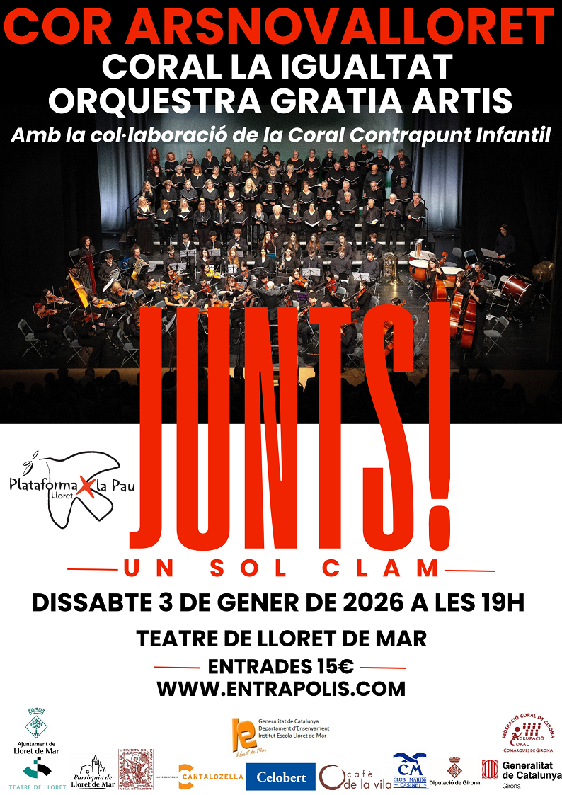 Concert del Cor ArsNovaLloret juntament amb la Coral La Igualtat de Gavà, l'Orquestra Gratia Artis i la col·laboració de la Coral Contrapunt Infantil de Malgrat de Mar.