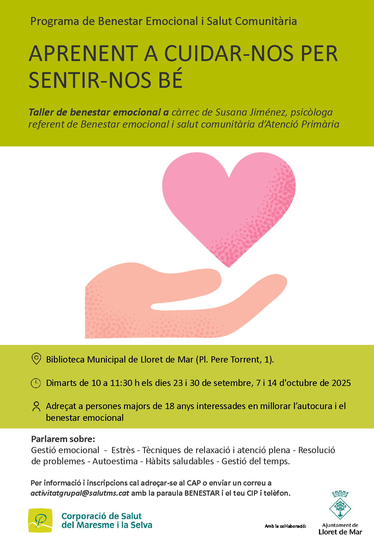 Taller de benestar emocional a càrrec de Susana Jiménez, psicòloga referent de benestar emocional i salut comunitària d’atenció primària. Adreçat a persones majors de 18 anys interessades en millorar l’autocura i el benestar emocional.