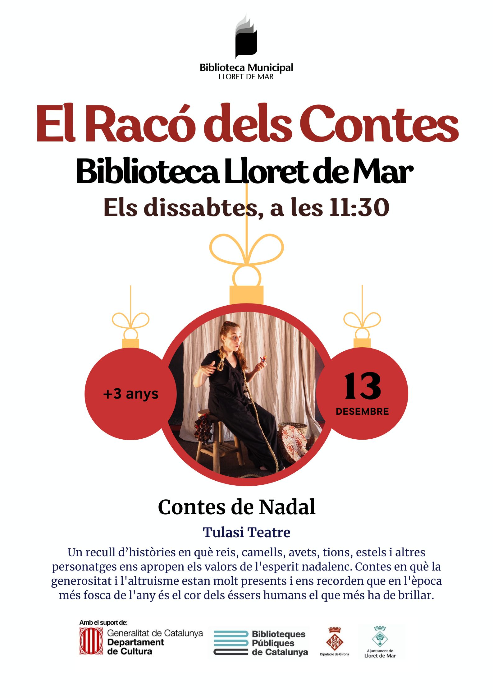 El Racó dels contes. +3 anys. Contes i postals de Nadal (contes+taller) Començarem la sessió amb els contes de Nadal en què apareixen els pastorets, els xais i els dimonis entremaliats. Seguirem amb el taller de postals, que està pensat per a un públic de més de tres anys. Es tracta de fer una postal de Nadal amb tècniques mixtes (collage+estampació) A càrrec de La Sal d'Olot